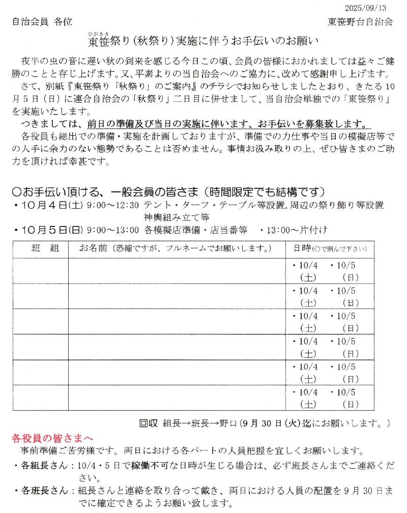 | 『東笹野台自治会』からのお知らせ |