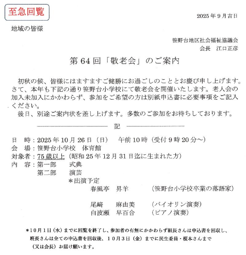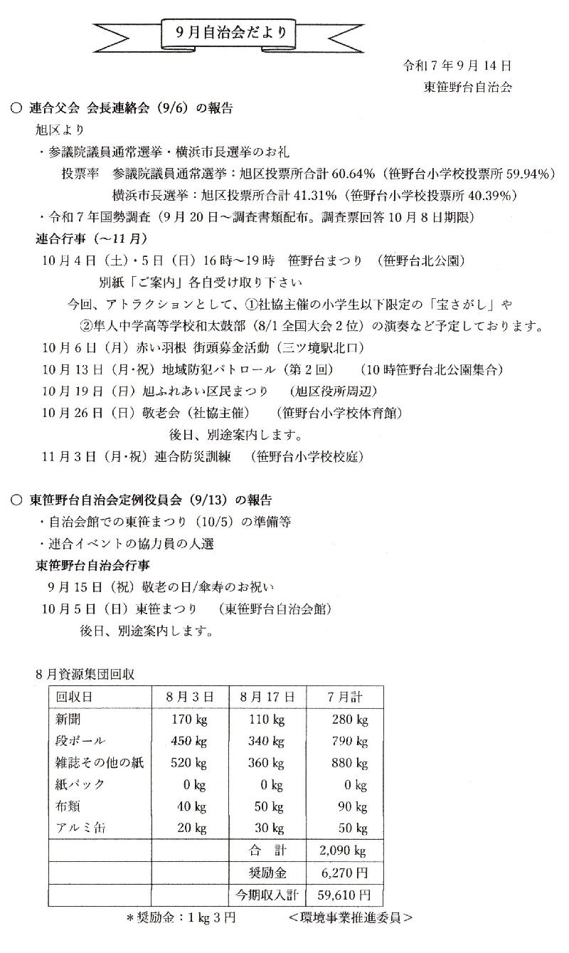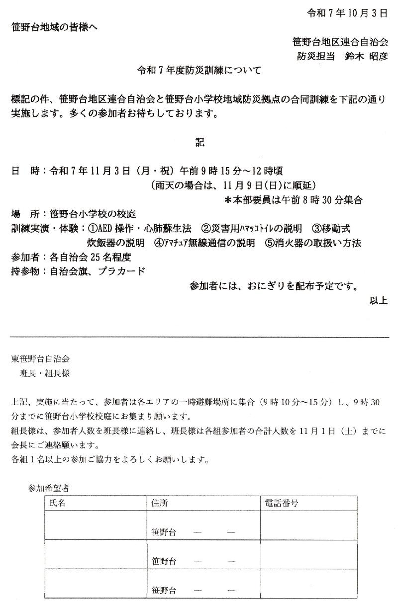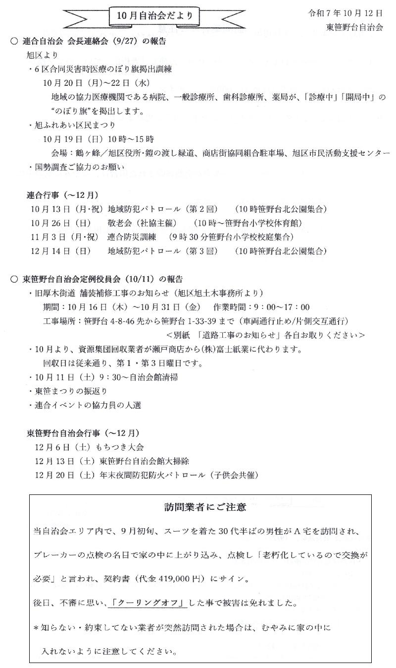 ①笹野坂付近道路工事予定(2025/10/16~10/31)と迂回路(参照) ②連合自治会/令和7年度防災訓練(11/3または9)参加確認 ③10月自治会だより(不審訪問業者へのご注意) ④12/6(土)11:00~12:45 もちつき大会のご案内(参照) ⑤重要資料:笹野台防災1:大震災の教訓と減災行動(参照) ⑥重要資料:笹野台防災2:家の耐震化や家具の転倒防止(参照) ⑦重要資料:笹野台防災3:備蓄品の準備(参照) |